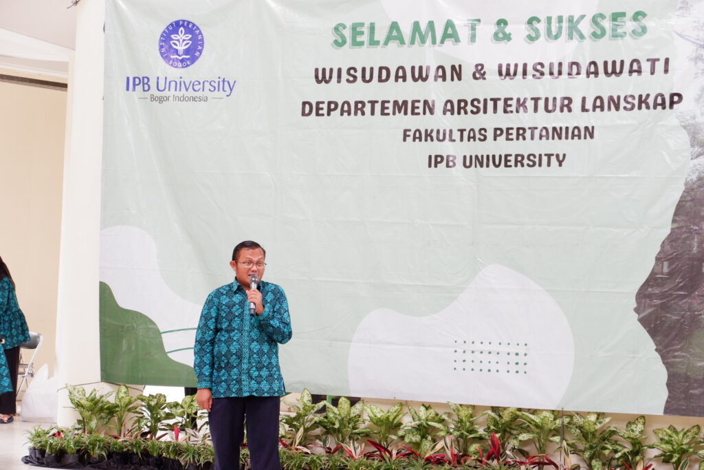 Ketua Departemen Arsitektur Lanskap dalam sambutannya menyampaikan apresiasi kepada seluruh lulusan atas kerja keras dan ketekunan selama menempuh pendidikan. Ia berharap para lulusan dapat mengaplikasikan ilmu yang diperoleh untuk berkontribusi dalam pengembangan lingkungan, perencanaan lanskap berkelanjutan, serta pembangunan ruang terbuka hijau yang berwawasan ekologis dan sosial.